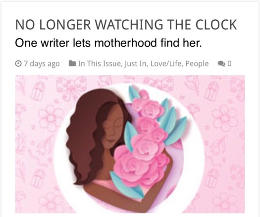 Posted on December 10, 2018December 10, 2018 by cijasquipsNew essay up on Baltimore Style magazine. No Longer Watching the Clock: One writer lets motherhood find her Share this: Click to share on Facebook (Opens in new window) Facebook Click to share on X (Opens in new window) X Like Loading... Related